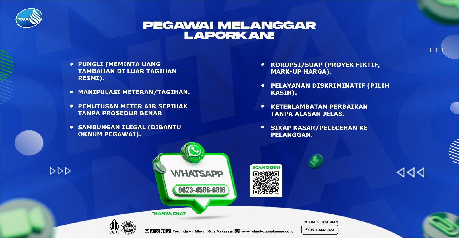 Perumda Air Minum Kota Makassar terus berkomitmen menciptakan layanan yang bersih, transparan, dan bebas kecurangan. Namun, keberhasilan menjaga integritas ini tidak bisa hanya dilakukan oleh manajemen. Kami butuh dukungan Anda.