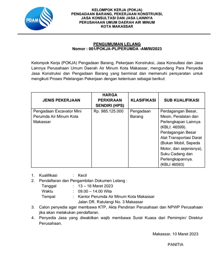 PENGUMUMAN LELANG Nomor : 001/POKJA-PL/PERUMDA -AM/III/2023 Kelompok Kerja (POKJA) Pengadaan Barang, Pekerjaan Konstruksi, Jasa Konsultasi dan Jasa Lainnya Perusahaan Umum Daerah Air Minum Kota Makassar, mengundang Para Penyedia Jasa Konstruksi dan Pengadaan Barang yang berminat dan memenuhi persy