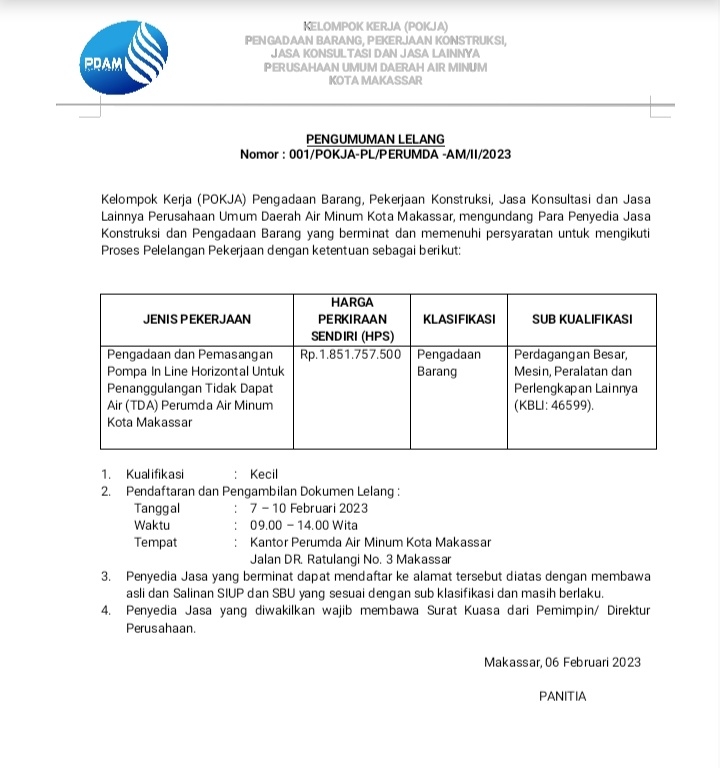 PENGUMUMAN LELANG Nomor : 001/POKJA-PL/PERUMDA -AM/II/2023 Kelompok Kerja (POKJA) Pengadaan Barang, Pekerjaan Konstruksi, Jasa Konsultasi dan Jasa Lainnya Perusahaan Umum Daerah Air Minum Kota Makassar, mengundang Para Penyedia Jasa Konstruksi dan Pengadaan Barang yang berminat dan memenuhi persya